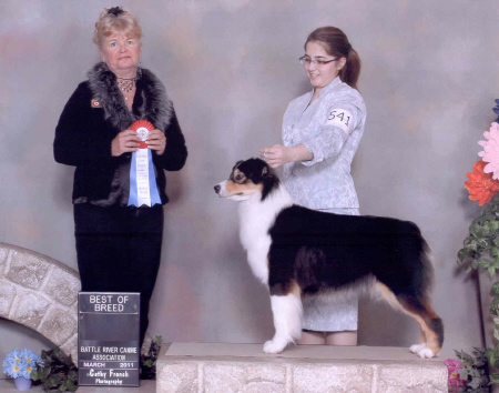 Call Name: “Capri”http://www.casselcreek.comCapri entered her first CKC show at 6 months of age and captured 3 WB, 2 BOW, and 3 BP awards for two 3 point majors and 7 points toward her Championship! At 7 months she went to 6 shows and came home with a 3 point major to finish her championship and 6 Best of Breeds, 2 Group 4 placements, a Group 3 and 2 puppy Group 1 placements! Capri is major pointed in ASCA taking a RWB and WB at her first show at 7 months of age. Capri has taken 7 Herding Group puppy wins and a Best Puppy In Show. She won large 6 – 9 classes at Waco Pre-shows 2010. Capri has taken several BOB and BOS and Group Placement at CKC shows at 14 months of age. Capri took a BOB from the classes over 6 specials and also a WB and BOW for all 3 ASCA majors at a show May 2011. Capri took a 5 point major May 2011 to finish her ASCA championship!!! Capri was a multiple premier winner at Wisconsin pre-shows and Nationals 2011.