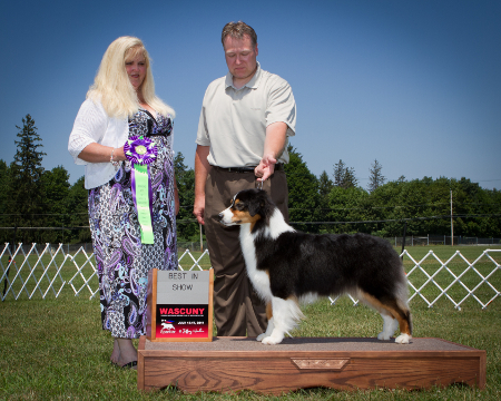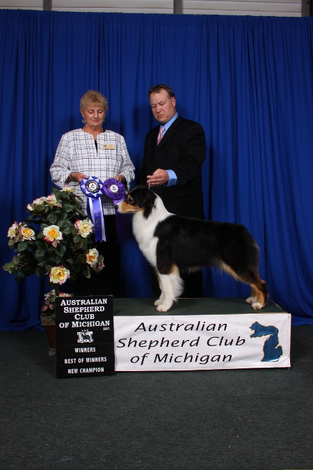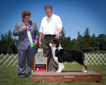 Call Name: Wynona finished her Championship at 15 months of age in 2 weekends with three 5 point majors. Her first time out as a special she took BOS over specials under breeder judge Sandy Rees. Finished her AKC Championship in limited showing with 3 majors and a Best of Breed over 4 specials. Wynona is a multiple AKC and ASCA BOB winner and MBIS ASCA winner! www.laconiaaussies.com Wynona finished the 2009 – 2010 merit year as #1 bitch and #3 dog beating 1,406 dogs!!!!! She finished the 2010 – 2011 merit year as #2!!!!! And not only is she pretty, she has her WTCH and Ranch Trial and Open Farm Trial titles!!!!!! Wynona captured multiple premiers at Nationals and the pre-shows in Wisconsin and a BOS under Carol Ann Hartnagle and Best WTCH under Sunday Miles!!!!!!! Wynona was BOS at the Regional Specialty in Michigan in January 2012.