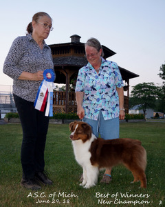 Two more AKC Champions “Jazz” and “Stella”. They both finished with BOB over specials out of the class! Stella also was RBIS OH and two OH Group 2! “Serenade” added more WB, BOW and BOS and has a few singles to finish AKC. She also took a lovely 4 point major and BOB in ASCA! “Carmen” took 5 A-BOB in NY and at Harvest Moon. “Beanie” finished her CKC Championship at a young age with majors, BOW, BOS over specials and Best Puppy wins. She also won a large CKC Breeder’s Sweepstakes!!!! “Ike” earned his ATCH 4 and “Miranda” earned her ATCH 2. “Meg” has started herding earning 1st on ducks, 4th on sheep, Most Promising Started Aussie and a OFTDm leg. “Swindle” has taken numerous ASCA BOB’s and BOS’s, earned her STDdsc, OFTDm, and 2 Most Promising Started Aussie. She also earned a 195 at a preshow to finish her RN. She was also a MVA qualifier! “Wynona” continues to get herding titles, and AFTDm and OFTDd!